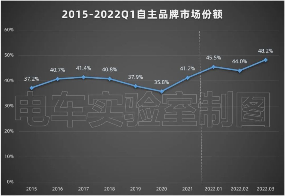 进入到2022年,自主品牌的市场份额维持强势增长,特别是在3月份,在乘用车市场整体销量同比下降10.5%的大环境下,自主品牌零售销量达到了75万辆,同比增长17%,环比增长37%。3月自主品牌国内零售份额为48.2%,同比增长11.5个百分点。