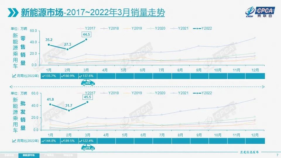根据乘联会的数据,今年前3个月,自主品牌累计份额达到了48%,相对于2021年同期增长9.7个百分点。另一方面,1-3月新能源乘用车国内零售107.0万辆,同比增长146.6%。