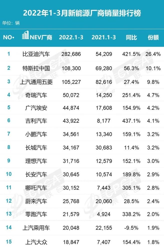 而在乘联会公布的1-3月新能源厂商销量榜中,前15位仅有特斯拉中国和上汽大众两家外资/合资厂商(上汽通用五菱在乘联会统计中归为自主品牌),其余13席均被自主品牌占据。