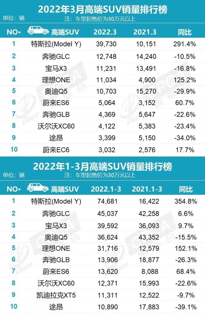 反观30万以上高端SUV榜单中,3月份理想ONE排到了第4位,蔚来ES6和EC6两款车型也顺利上榜,再加上表现抢眼的特斯拉Model Y,前10中已经有4款新能源车,而且新能源车的增速远远超过了燃油车。