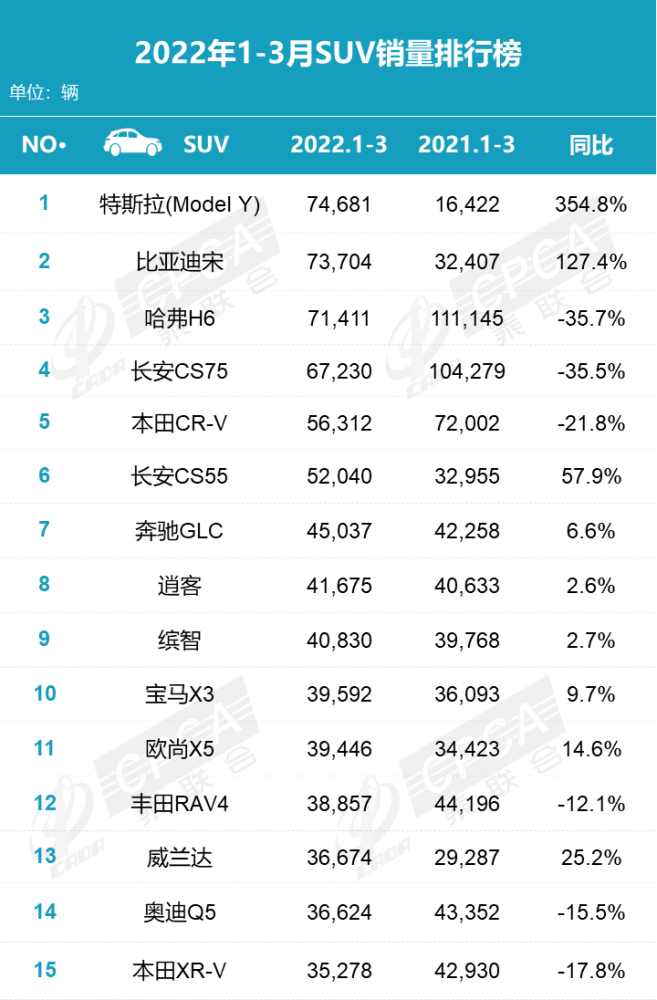 一季度累计销量方面,特斯拉凭借3月亮眼的表现,直接成为第一;比亚迪宋成功超越哈弗H6跃居第二名;而哈弗H6的累计排名则跌至第三位,同比下滑35.7%。