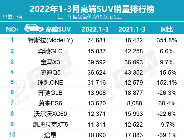 回过头来,本次榜单第一名是特斯拉Model Y,爆卖了39730辆,同比增长291.4%。3月底,特斯拉上海超级工厂停产,后续新车的交付或将受到一定影响。豪华品牌还有奔驰GLC、宝马X3、理想ONE上榜。