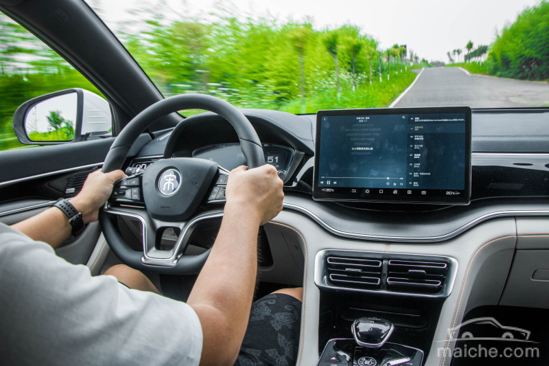 动态试驾 首先这是一台接近2吨重的SUV,但实际驾驶起来却很轻快,在城区行驶时,电量充足的状态下,首先车辆会采用“先电后油”的策略,此时以后轮电机驱动,动力输出较强且稳定持续,能感受到宋PLUS DM-i动力输出线性直接、油门响应干脆利落,在堵车起步时毫不拖沓,动力响应可以说是媲美纯电车型。当深踩油门试着超车、并线时,发动机将和发电机会串联共同驱动电机,车辆在瞬间就能爆发出强劲的动力,高速上加速动力体验完全不输于2.0T高功率发动机的水准,可以说是快入人心!