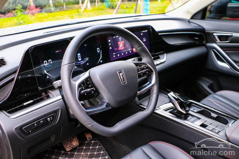 作为一款新潮的国货产品,新车的方向盘一改传统的三辐式设计,以横向镂空双横幅为主基调,合理布局多功能按键,主要以音量、蓝牙电话、功能选择和确认/返回等为主。同时,打孔真皮的配置在触感层面也值得认可。