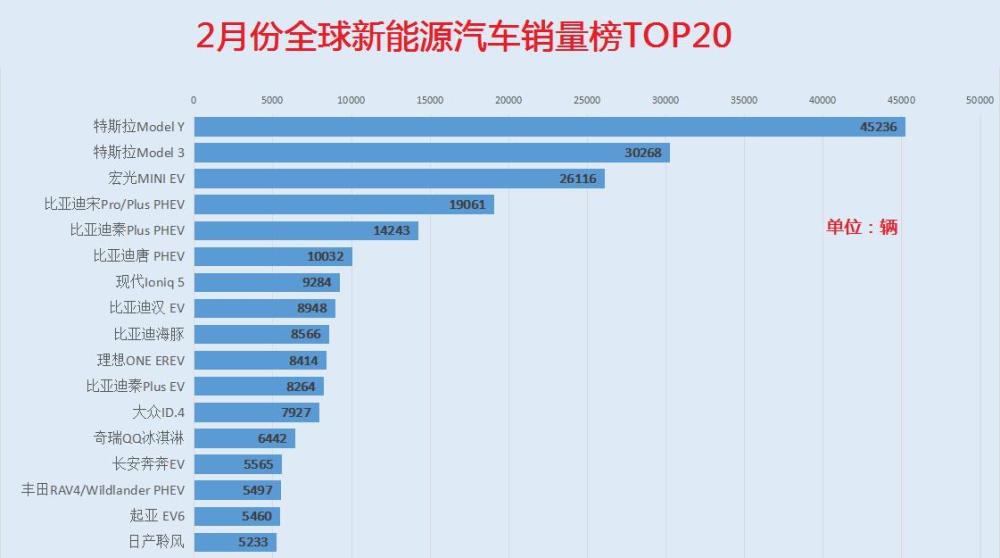 首先,特斯拉汽车包揽了冠亚军,特斯拉Model Y夺得冠军,2月份全球销量为45236辆,其中我们国内的销量为32403辆,占比高达71.6%,特斯拉Model 3获得亚军,2月份全球总销量为30268辆,我们国内的销量为24112辆,占比为79.6%。不难发现,中国已经成为了特斯拉最大的市场,两款主打车型的销量占比都超过了70%。