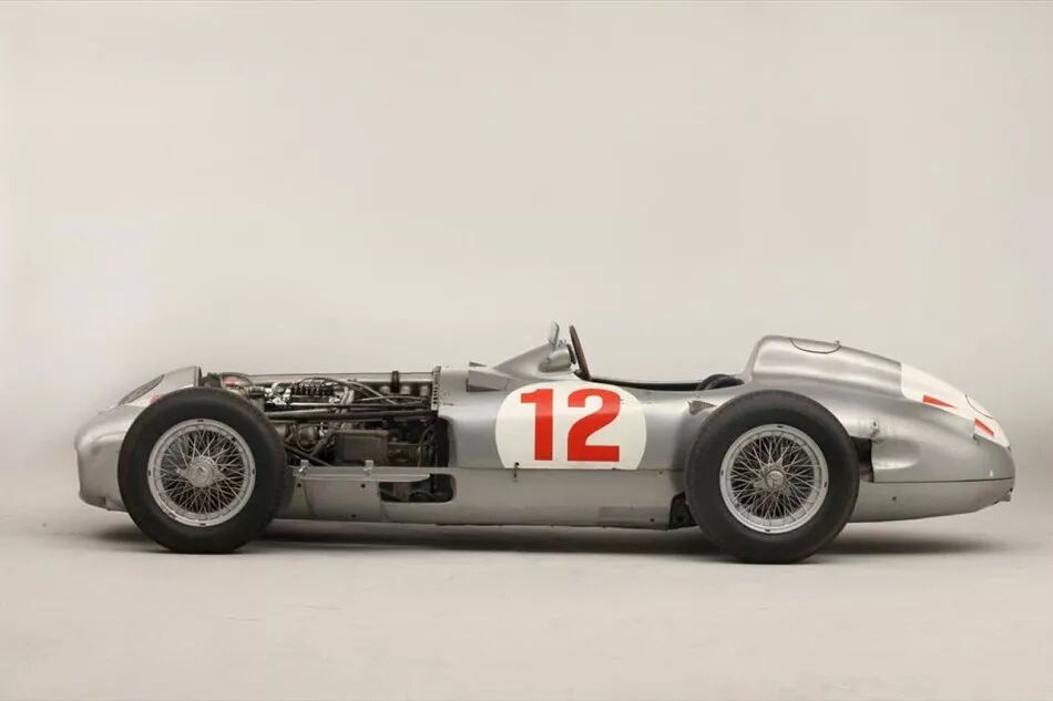 梅赛德斯-奔驰W196R赛车曾赢得1954年德国和瑞士大奖赛,当时是由阿根廷传奇车手胡安•曼纽•方吉奥(Juan Manuel Fangio)驾驶。起初,为了提高气动效率,这款赛车的车身覆盖住了全部四个车轮。之后方吉奥要求改装成现在的开放式车轮样式,以更好地在拥挤的赛道上行驶。这款2.5升8气缸梅赛德斯-奔驰W196R赛车配有当时顶尖的赛车技术,包括全独立悬架、燃油直喷8气缸发动机、中央制动器等。这款W196R赛车也被称为是制造最精美的赛车。