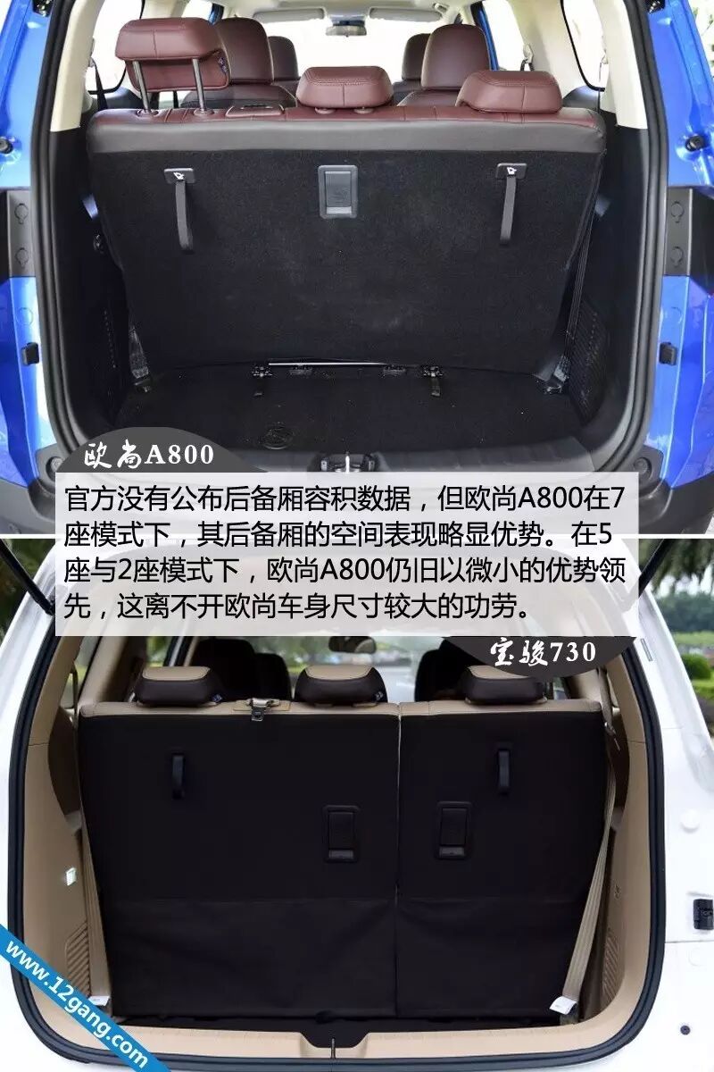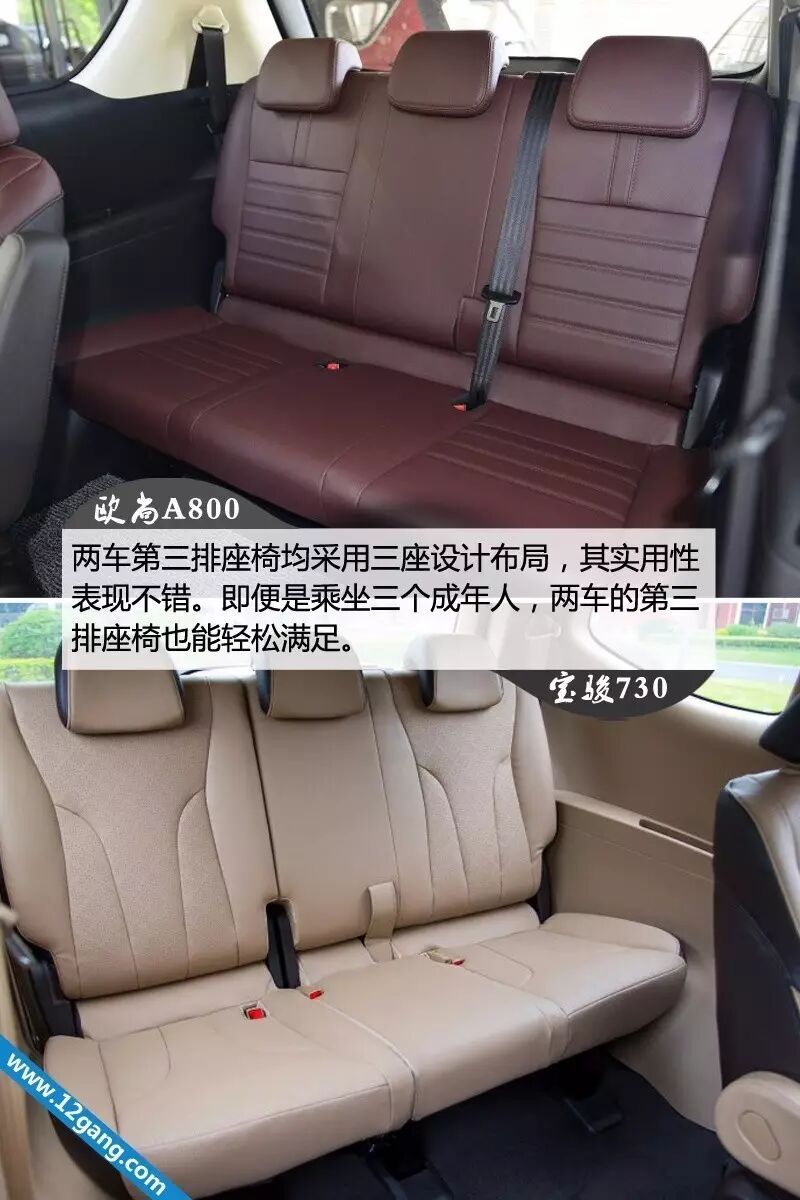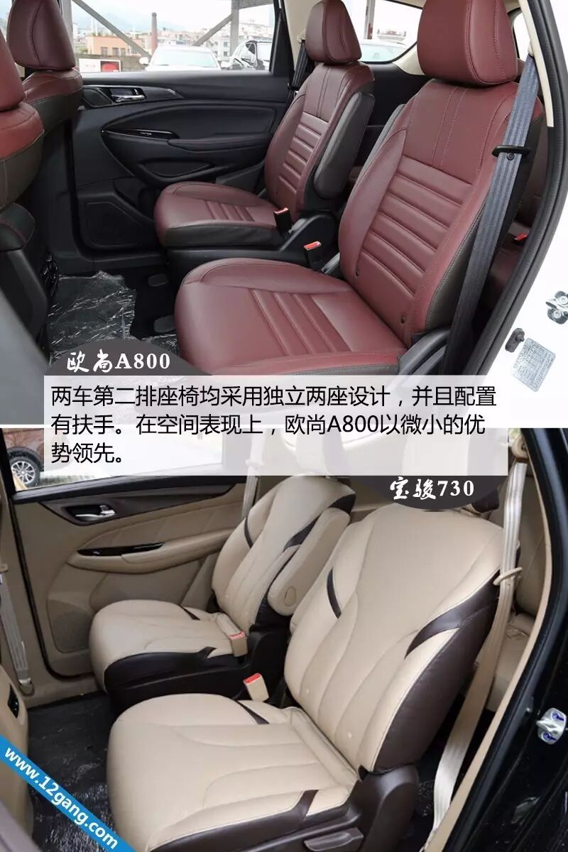 在车身尺寸、轴距方面,可以看出欧尚A800的优势明显,加上相同的2+2+3布局,自然而然,其空间的表现比宝骏730更出色,尤其在腿部空间方面,下文会详细提及到。