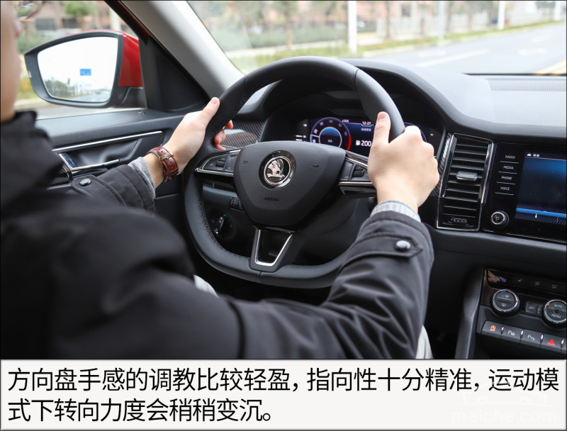 在转向手感的建立上,柯迪亚克GT也着实不赖,普通模式下转向比较轻盈,但是不会有那种虚假的电子感,整体驾驭起来还算很轻松;运动模式下转向会稍稍变沉,指向性更为精准,整个力回馈的手感也营造得很到位。