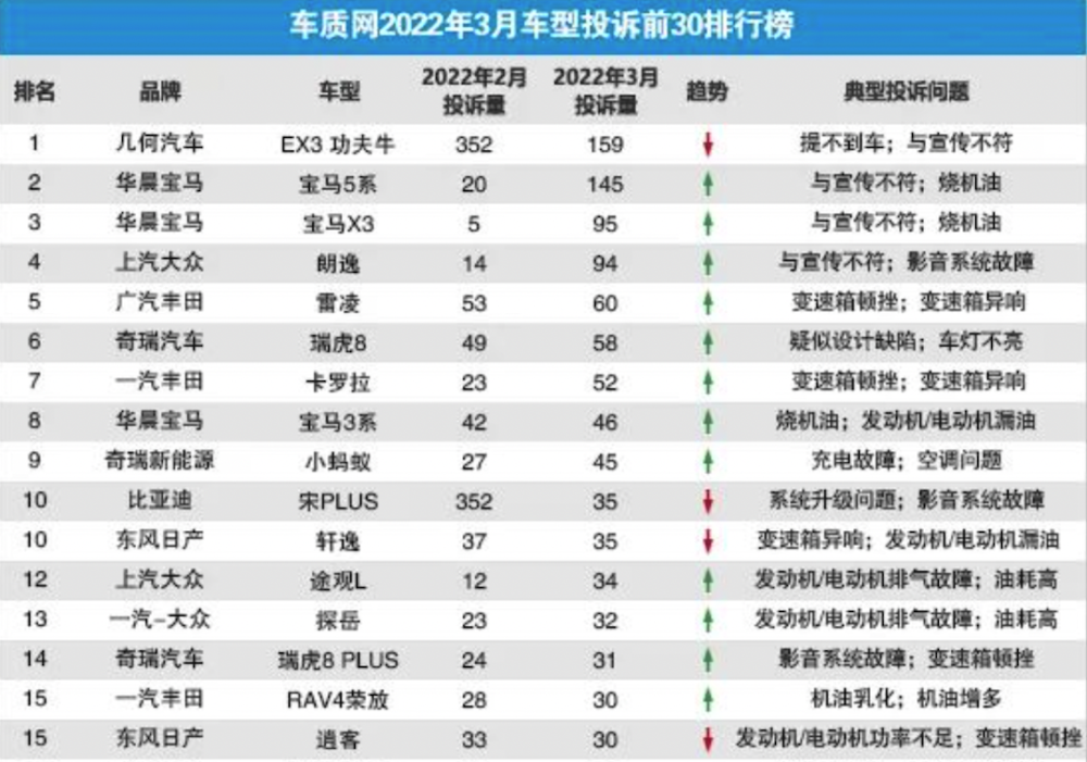 对于销量下滑明显,虽然官方给出的解释是销量受到疫情、芯片等因素影响,但是抛开这些客观因素,我们也确实看到了一些宝马自身暴露出来的问题。尤其是当前宝马产品质量问题频发,被众多中国消费者投诉。从2022年2月份开始,宝马5系、X3、3系,已连续三个月上榜车质网投诉排行榜前十。尤其是3月和4月份,宝马5系及宝马X3连续进入投诉排行榜前五。