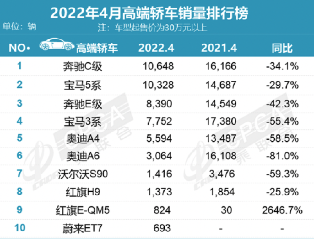 榜单中更令人诧异的是曾经频频霸占榜首位置的宝马3系,如今已经不见踪影。被老对手奔驰C级超越也就算了,甚至现在已经被自家定位更豪华的宝马5系超越,让人感觉宝马的产品体系已经乱套了。根据数据显示,奔驰C级在4月共销售新车10648辆,拿到了销量榜冠军;宝马5系位居第二,4月共销售新车10328台,这也是此次榜单中仅有的两款销量破万车型。