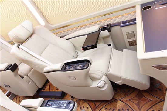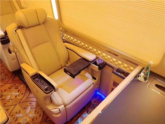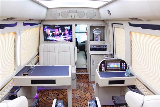 丰田考斯特(柯斯达)改装新车不仅有180度旋转带腿托的首长席,华通丰业还配备了全桃木的办公桌和全桃木外饰的4L冰箱。车为私密玻璃在配上吸顶式空气净化器,即便是在秘闭的车内也能呼吸到新鲜的空气。
