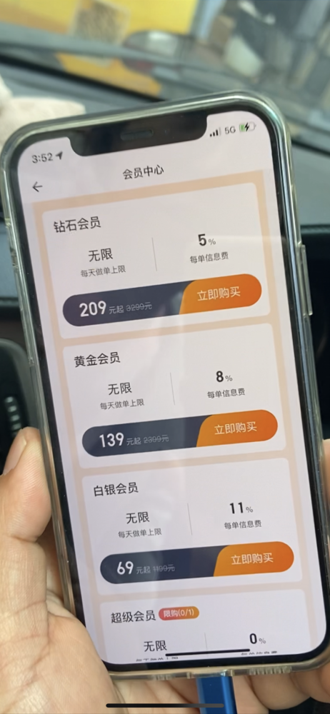 在旧系统中,会员分为月付299元的初级会员,月付549元的高级会员和月付899元的超级会员。其中,初级会员每天第1单不收取信息费,高级会员每天前5单不收取信息费,此后的每单都收取15%的信息费。而超级会员则没有限制,接多少单都不收取信息费。12月初,旧会员系统正式下架。
