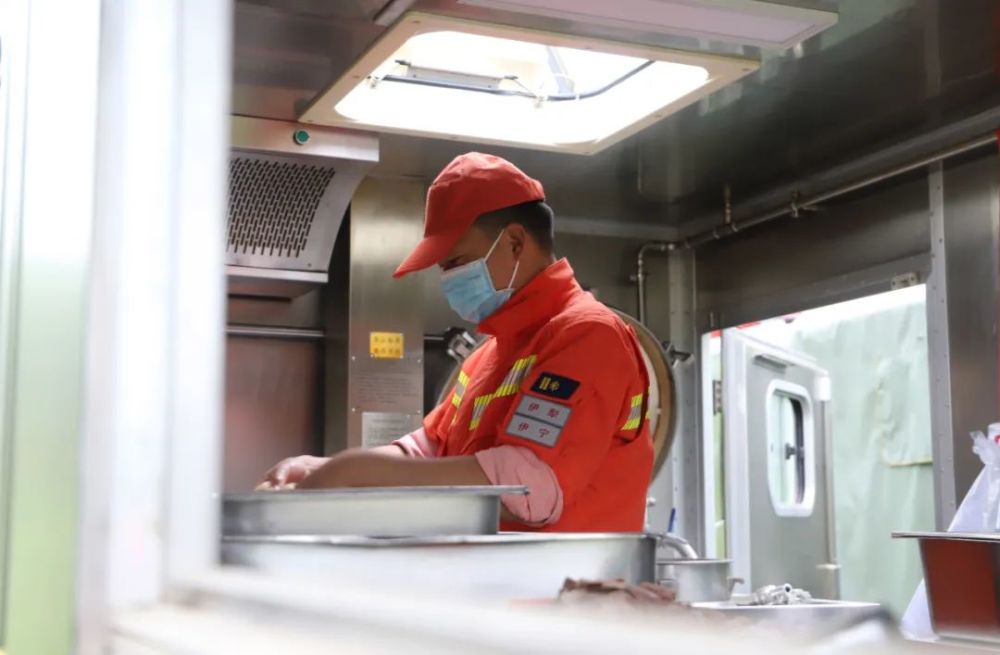 兵马未动地震救援车,粮草先行。这既是一句古训,更是应急保障工作的精髓。炊事人员利用炊事车和野战给养器材单元箱实地操作,快速展开作业,从炊具展开到打气点火,从切菜配料到挥铲烹饪,每名炊事员分工明确,动作干净利落。只看菜板上刀光四射锅铲飞舞,“哒哒哒哒……”的切菜声让人紧张而又期待。各色调味品挥毫入锅上下翻动,它在“大师”们的手中拿捏精准、颗粒不差,整个操作间井然有序,一片热火朝天。保证了救援人员有充足的战斗力投入到抢险救援中,为此次地震救援演练的成功奠定了坚强的后盾。
