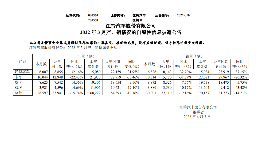 中国网汽车4月19日讯 (记者 王忆东)记者从江铃汽车股份有限公司近日发布的产销快报获悉,2022年3月份,江铃汽车的产量为2.86万辆,同比下降15.74%;销量为3.00万辆,同比下降19.18%。今年一季度的累计产量为6.82万辆,累计同比下降19.16%,累计销量为7.02万辆,累计同比下降14.21%。江铃旗下主要产品包括JMC品牌轻型卡车、皮卡、轻型客车,驭胜品牌SUV,福特品牌轻客、MPV等商用车及福特品牌SUV。