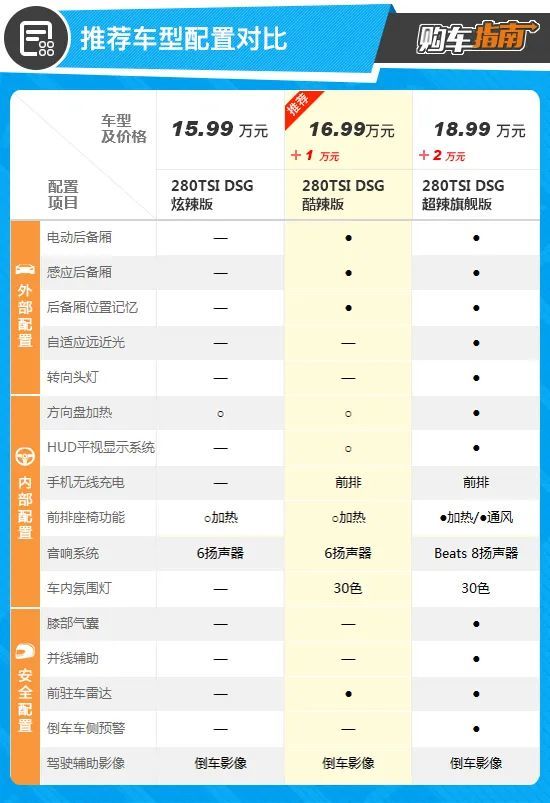 购买高端紧凑型车的消费者更注重舒适性配置的丰富性,所以诸如可感应开启的电动尾门、前排手机无线充电、30色车内氛围灯等功能就显得尤为重要。如此看来,酷辣版就显得比较合适了。虽然与超辣旗舰版相比上汽大众,推荐车型少了很多高阶配置,但已经能满足大部分年轻消费者对于时尚和高级感的需求。并且包含方向盘加热和前排座椅加热的“辣选加热套组选装包”以及“W-HUD抬头显示选装包”仅该版本车型可选,消费者可以用更实惠的价格选择适合自己的配置。