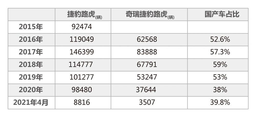 据其官方统计数据显示,2020年,捷豹路虎全球总销量为425974台,同比跌幅超过23%,其中,中国市场售出98480台新车,同比下滑2.7%,而奇瑞捷豹路虎销量则进一步溃缩至37644台,占比仅为捷豹路虎在华销量的38%,创历史新低。