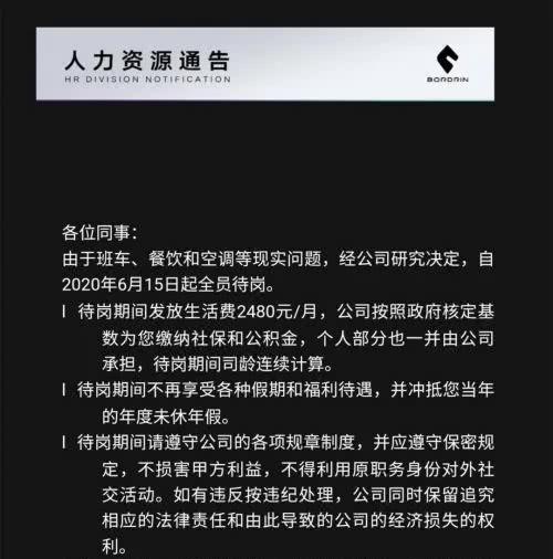 6月15日,博郡汽车发公告称,自2020年6月15日起全员待岗。同时,规定待岗期间发放生活费2480元,待岗天数自动冲抵年度未休年假。离职可扫描二维码办理,如实现就业,告知公司双方即可解除劳动关系。