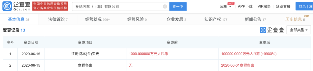 6月15日,爱驰汽车(上海)有限公司注册资本发生变更。注册资本由1000万元变更为10亿元,增资幅度达9.9亿元。