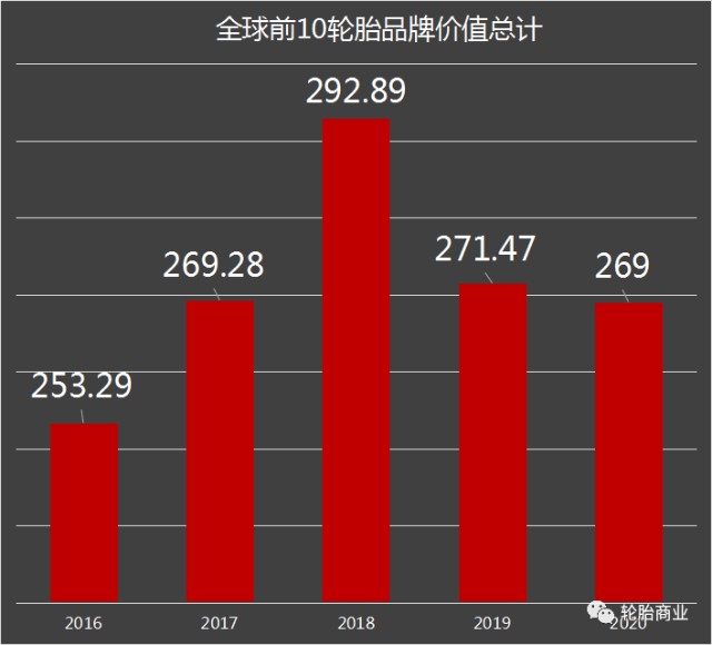 在2018年全球前10轮胎品牌价值总计达到了顶峰,2019年发生了断崖式的下降,2020年全球前10品牌价值总计持续下降,差不多与2017年相差无几。总的趋势来看汽车轮胎品牌排行榜,全球轮胎品牌价值正在被稀释。