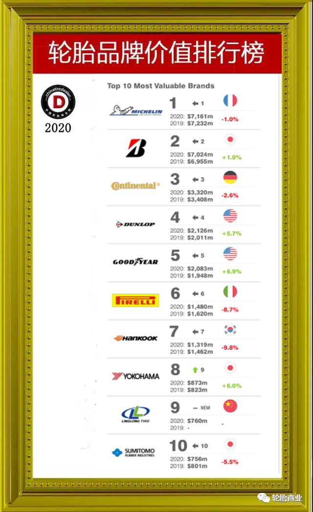 2020年3月汽车轮胎品牌排行榜,最新外国评判的轮胎品牌价值排行榜出来,今年最大的变动是作为国产轮胎品牌玲珑轮胎登上榜单,并且排名第9,而且是唯一一家上榜的轮胎企业。而已经在榜单连续多年的玛吉斯在今年并没有出现。除此之外,其他排名几乎没有太大的变化,优科豪马前进了一名。