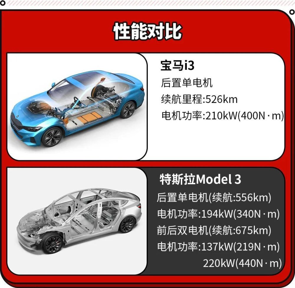 虽然宝马i3单机比Model 3后轮驱动版本的的电机功率要大,但是加速能力并没有更强。因为宝马i3的车重达到两吨多,而特斯拉Model 3后轮驱动版本车重仅有1.7吨左右,特别是百公里加速,宝马i3的做出了6.2秒的成绩,特斯拉Model 3单电机就拥有6.1秒的成绩。