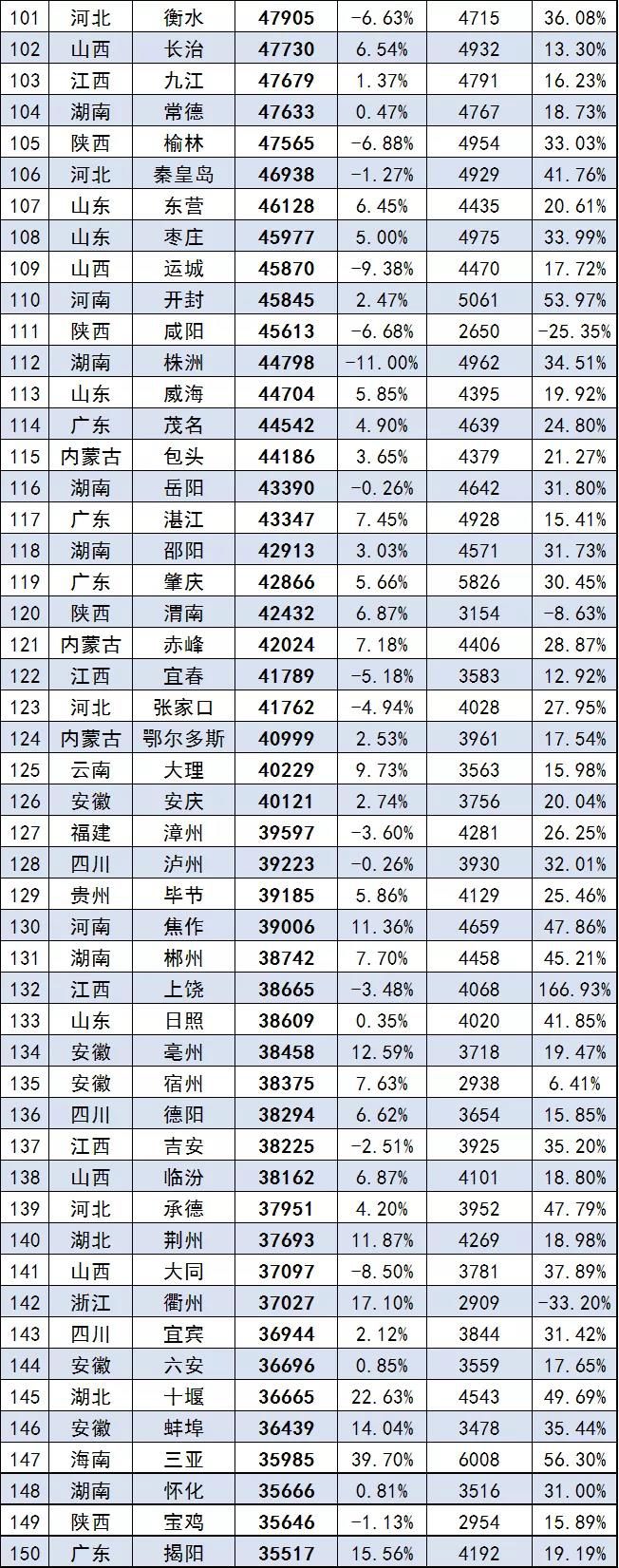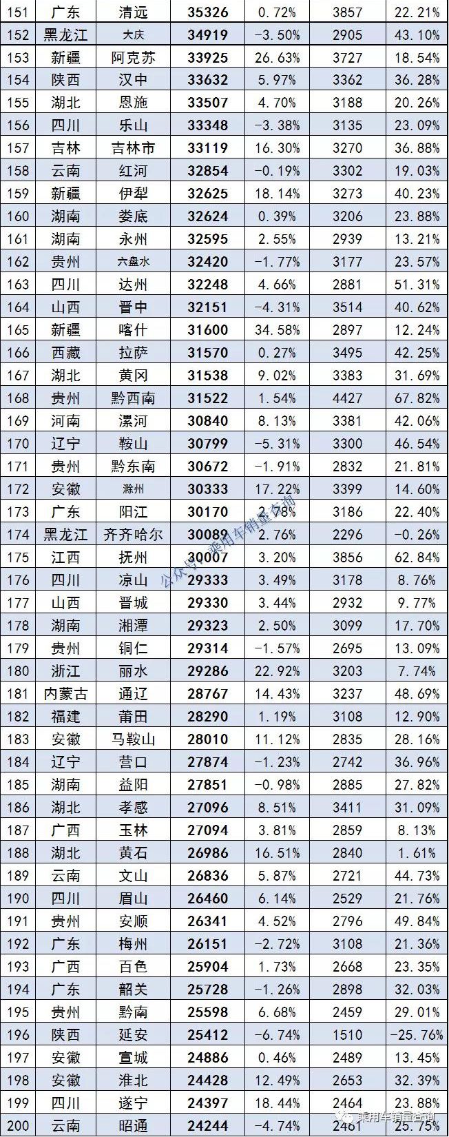 排名前十的城市还有广州(NO.4)、郑州(NO.5)、重庆(NO.6)、深圳(NO.7)、杭州(NO.8)、苏州(NO.9)、天津(NO.10),从榜单中可以看到,排名前十的城市中,仅有河南郑州全年累计销量有1.54%的略微下滑。
