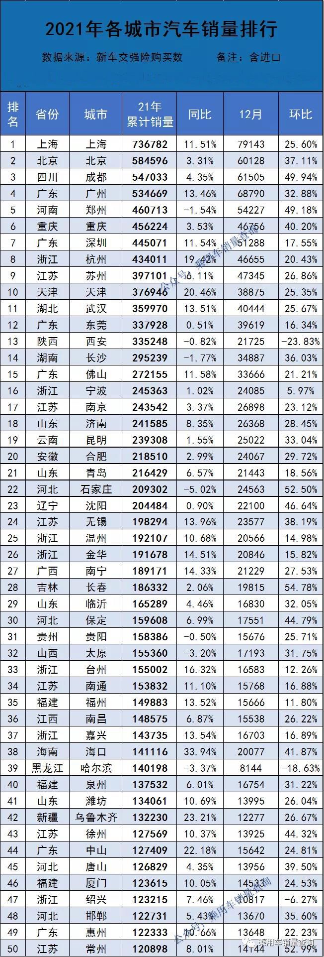 [车友头条-车友号-阿贵看车]今天,乘联会发布了2021年全国各城市汽车销量排行榜,根据于新车交强险数据(含进口)显示:2021年国内乘用车全年累计销量同比上升6.2%,为2118.2万辆,其中12月份销量为227.2万辆。那么2021年全国各大城市都为汽车市场贡献了多少力量,让我们一睹为快!