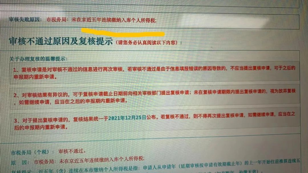并档成功后,李女士本以为事情就结束了。但2021年上半年小客车摇号进行审核的时候,她发现自己的审核未通过,原因写的是:未在京近五年连续缴纳入库个人所得税。但事实上李女士的个税一直都按时缴纳。