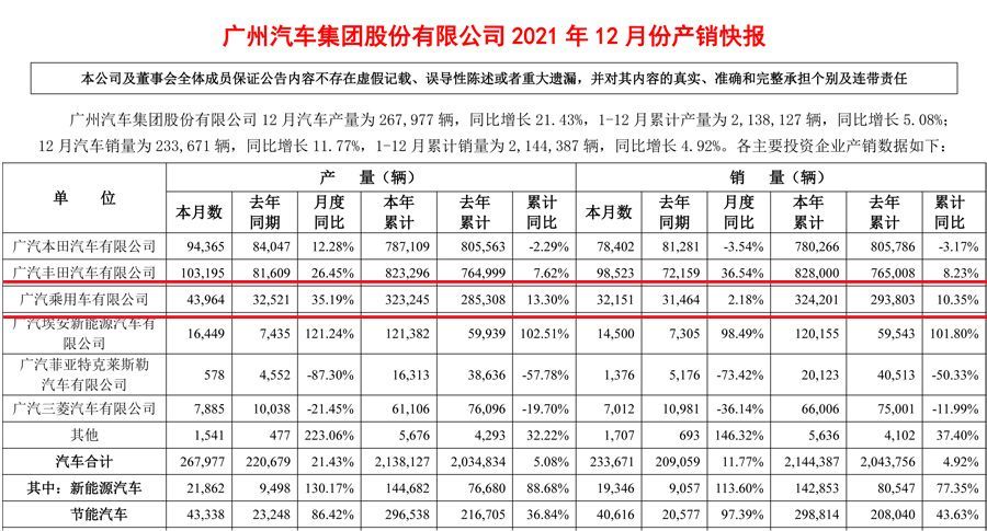 在集团层面,广汽集团2021年全年累计销量达到214.4万辆,同比增长4.2%,广汽传祺和广汽埃安两大自主品牌销量均获得增长。广汽丰田销量再创新高,全年销量达到82.8万辆广汽传祺销量,同比增长8.23%。不过广汽本田销量同比下滑3.17%,而广汽三菱和广汽菲克销量分别下跌11.99%和50.33%。