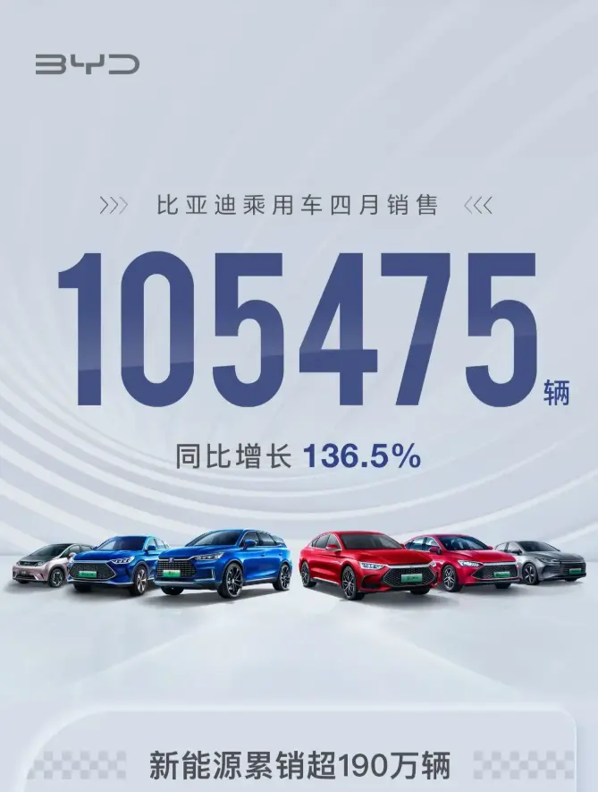 而这边的比亚迪表现依旧十分迅猛,4月份销量105,475辆,同比增长136.5%,环比3月份103,229辆还略微上涨。
