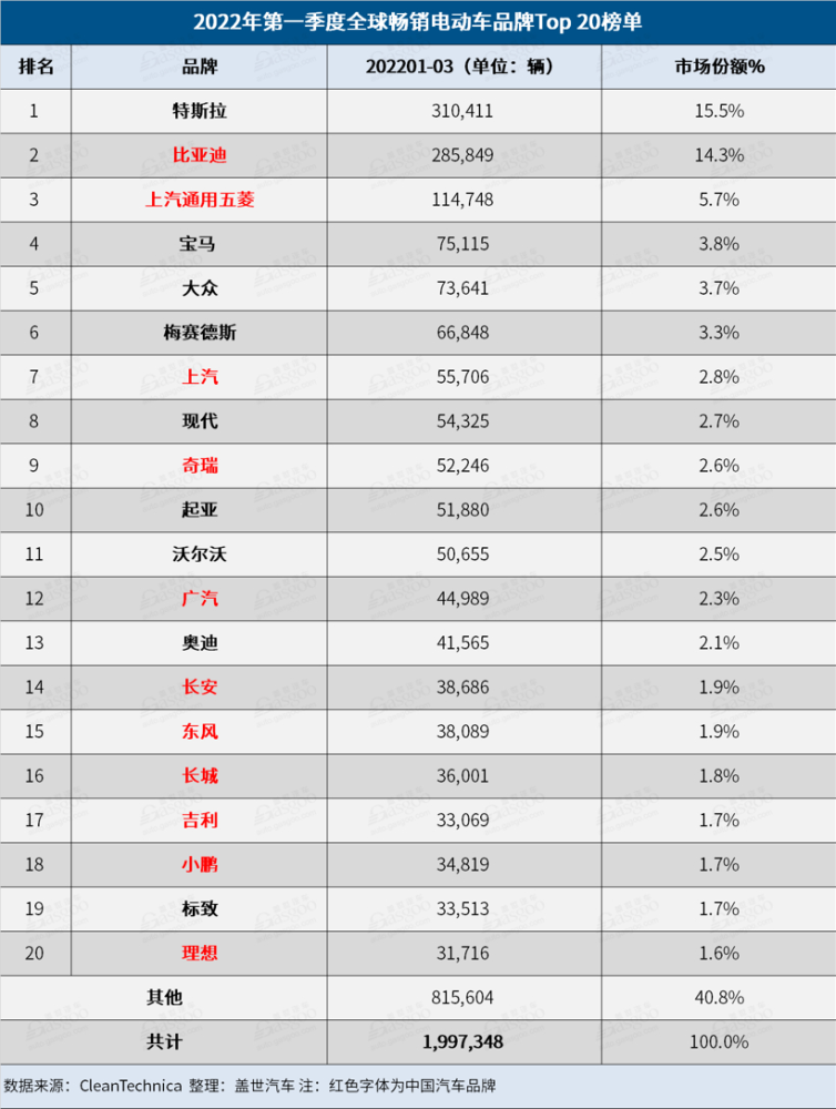 3月全球Top 20电动车品牌榜:特斯拉反超比亚迪