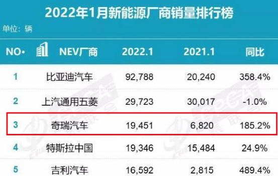从今年1月份新能源厂商销量排行榜来看,奇瑞新能源的销量达到了19451辆,同比增长了185.2%,仅次于比亚迪、上汽通用五菱排在了第三名。